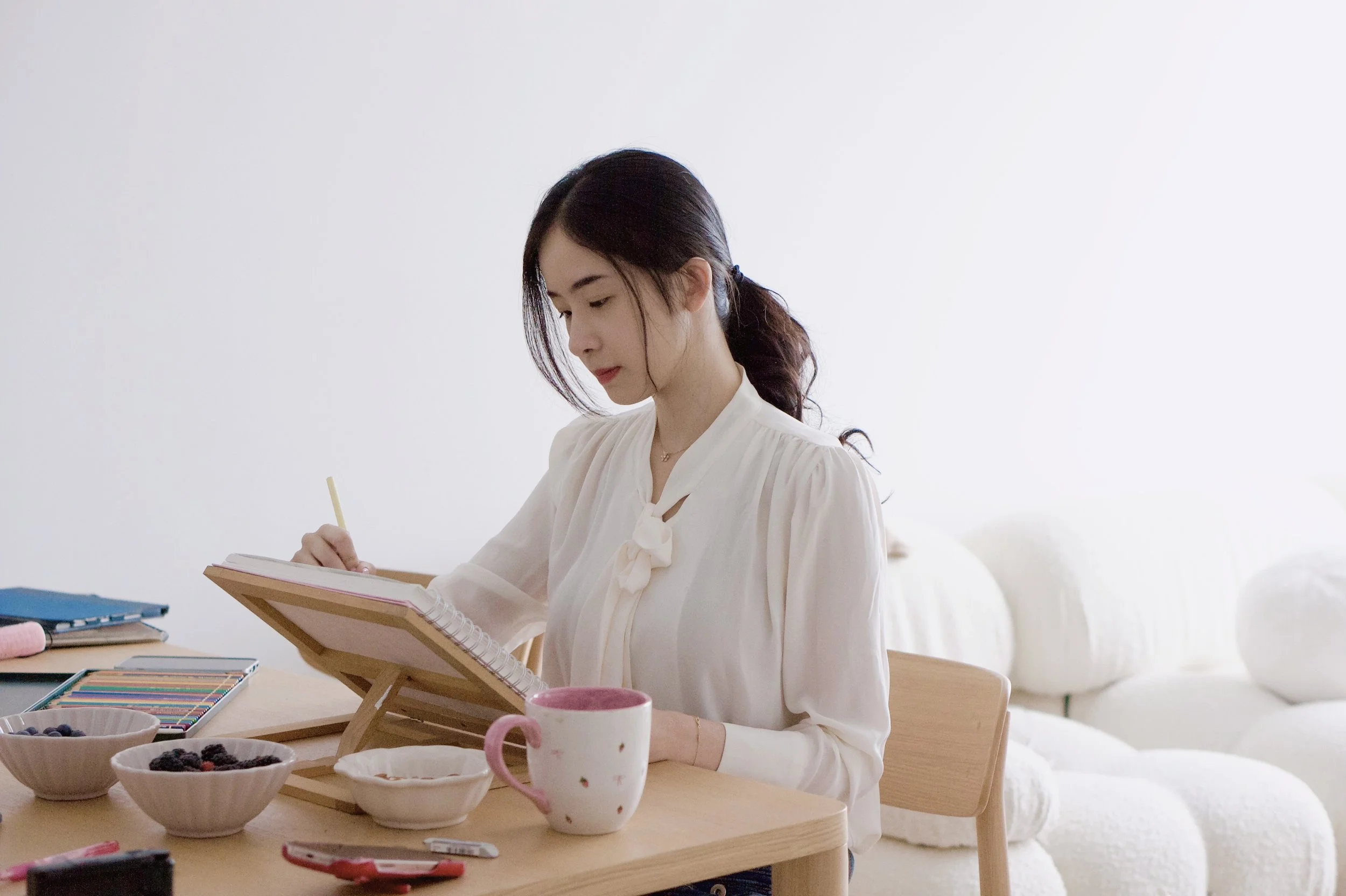 Now I make art that reflects that shift. Things that feel calm, a little nostalgic, sometimes playful, sometimes thoughtful. I’m inspired by everyday moments, quiet feelings, good food, pretty objects, and small rituals that make life feel softer.